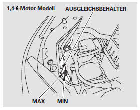 Überprüfen Sie den Kühlmittelstand im Ausgleichsbehälter. Vergewissern Sie sich, dass er zwischen den Markierungslinien MAX und MIN liegt. Falls er unter der MINLinie liegt, schlagen Sie Nachfüllen von Motorkühlmittel auf Seite auf. Dort finden Sie Informationen über das Nachfüllen des vorgeschriebenen Kühlmittels.